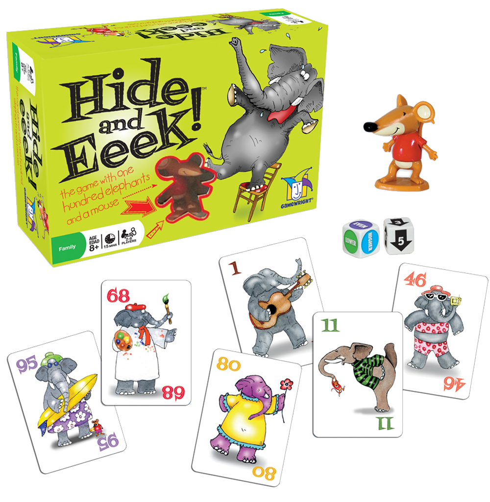 One hundred giant elephants are running amok, but one tiny mouse has got their number! Roll the dice and move the mouse around the board, searching high and low for elephants that are either higher or lower than the number on your card. If you spot a mouse hiding on a card, shout Eeek!and grab the mouse figurine before it scampers away! You’ll need to have a memory like an elephant and be quick as a mouse to win!