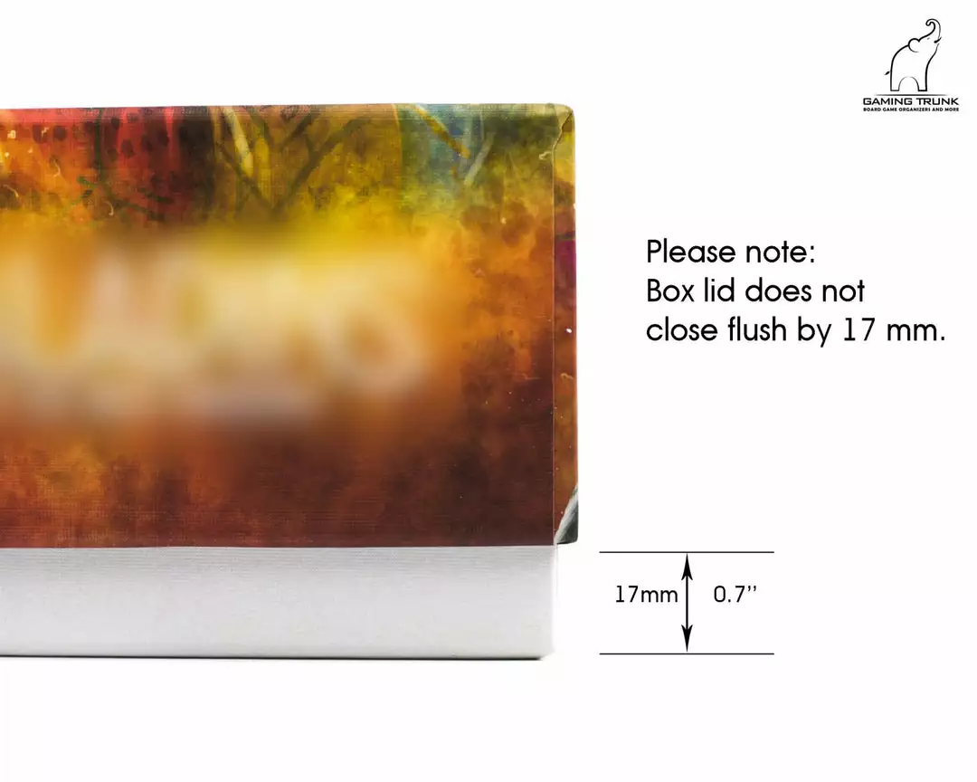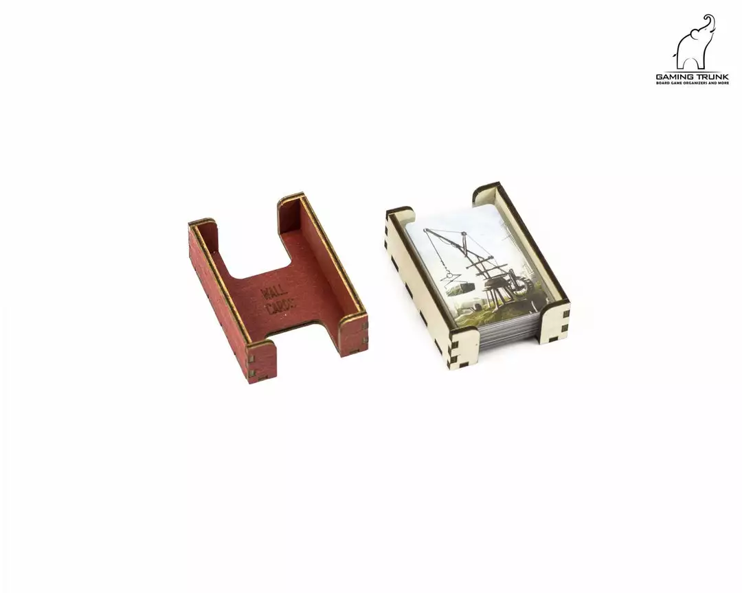 The 4 small card trays store the Debt, Suspicion, Tavern, and Wall cards. These card holders support sleeved cards up to 48×71 mm @100 mkm. The trays are removable from the box and help keep cards organized during the game.