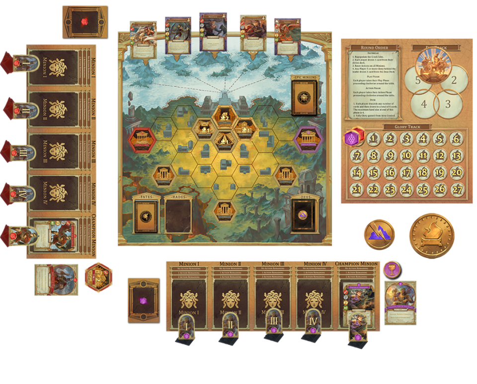 Command your forces during the action phase. Manage Minion actions for combat, area control, and tactical advantage. Send your Minions to the Greek Isles to recruit epic heroes and monsters of legend, such as Medusa, Perseus, and Pegasus. Organize your forces wisely. Positioning is key to victory!