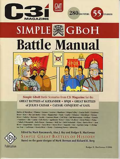 This special C3i Magazine (RBM) publication contains Simple GBoH versions of every GBoH battle that has been included in the back issues of C3i Magazine from issue No. 1 through 14, and also the “C3i – SPQR Player’s Guide”.