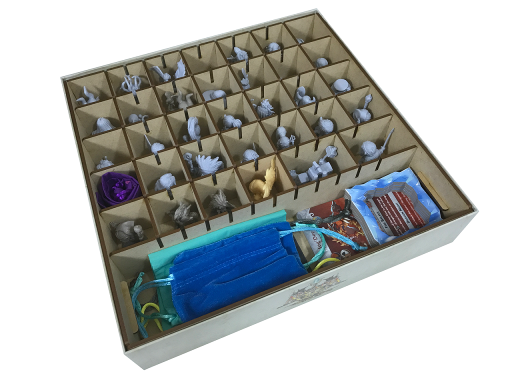 Our storage solution for Arcadia Quest: Inferno Hell of a Box provides storage for minis, dragon tokens, jumbo cards, dice bags, and other items. This solution is designed to be placed in a Hell of a Box. If you received a Hell of a Box as part of your Kickstarter pledge, you will definitely benefit from the minis and card storage with this solution.