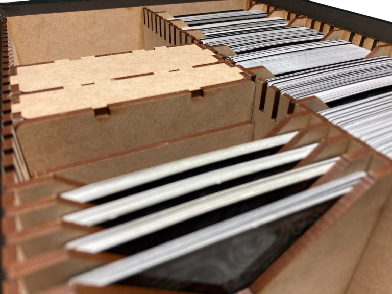 Ascension has been a favorite at our table for years. The one thing we struggled with was card storage as we added expansions. This organizer provides two card storage lanes that can handle sleeved or unsleeved cards. There is a dedicated storage area for the two (2) tier, stacked bit trays. We include sixteen (16) wood dividers and you can purchase more if needed.