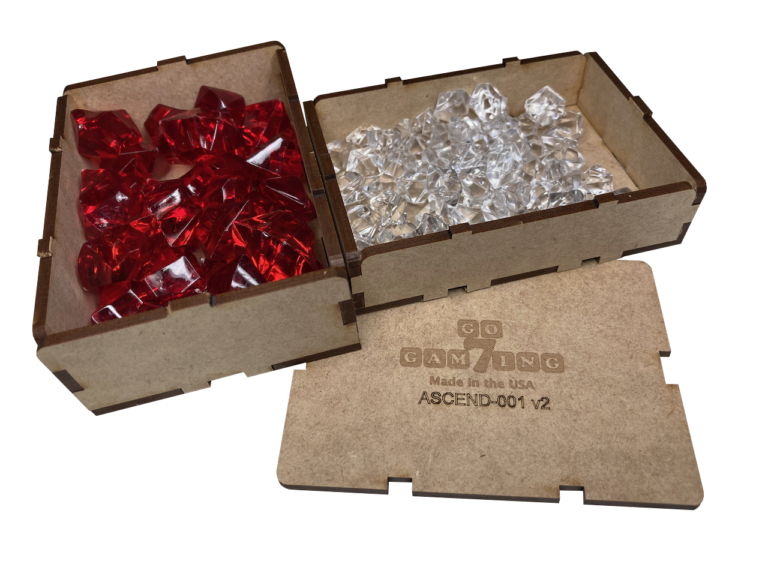 The Go7 Gaming organizer for Ascension features two card storage lanes, sixteen (16) wood dividers, and a two-tier, lidded bit box for your honor tokens. This insert fits in the first-edition Chronicle/Storm-sized box.