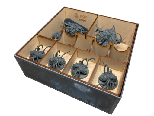 This Go7 Gaming organizer for CMON’s Bloodborne™ offers two trays, providing storage for your minis and as many as two large, square map tiles.  This solution fits in a small expansion box such as Mergo’s, Yahar’Gul, and Byrgenwerth.