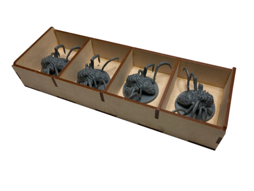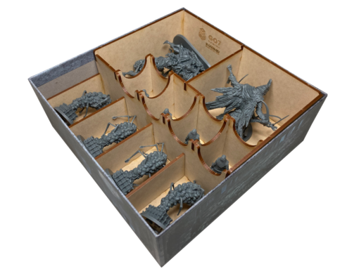 This solution is designed to store a selection of minis from Mergo’s, Yahar’Gul, and Byrgenwerth and two (2) large, square map tiles.