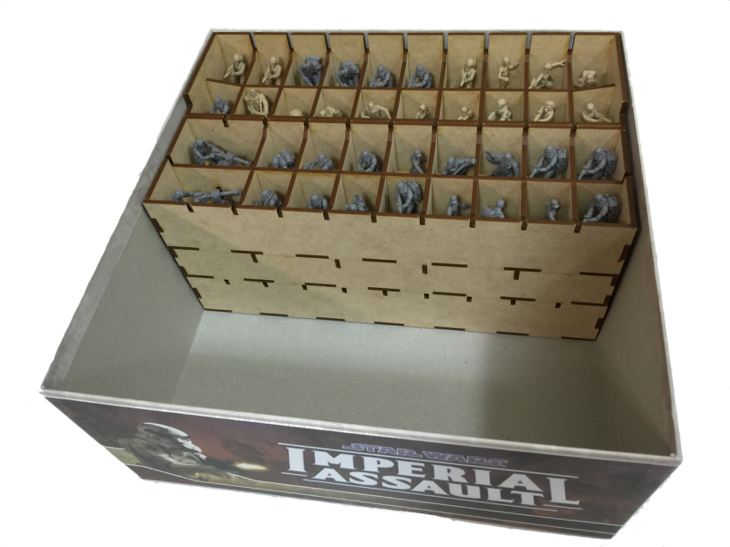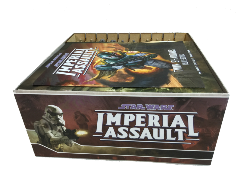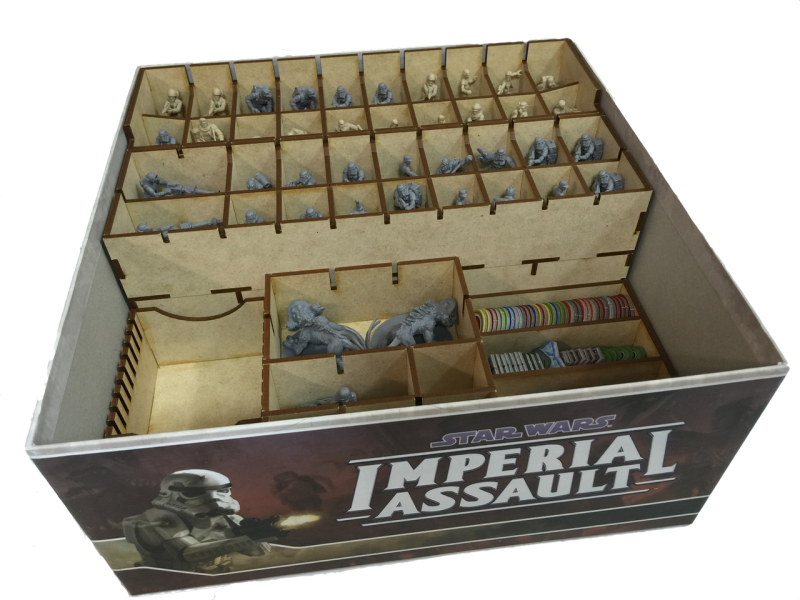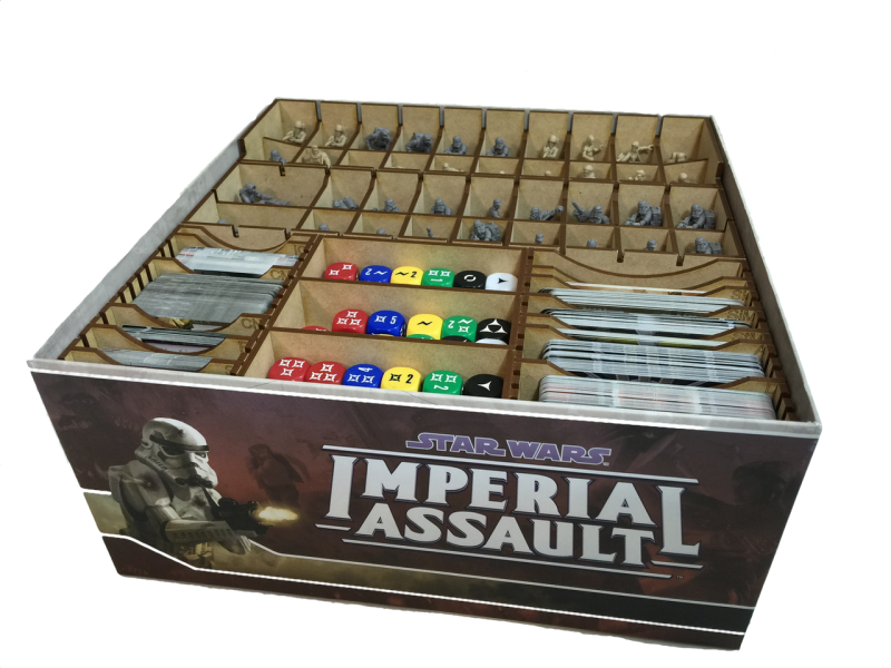 Our Imperial Assault insert is colossal! It’s the largest box insert we have designed to date, consisting of 14 storage trays. Each of the trays is designed to be pulled out of the box for setup and we have designed token trays for use during play. We designed this insert to store everything from the base game through Wave 4+. This includes Twin Shadows, which is required to store the map tiles (once you place the components in the insert). Best of all, if you own all of the expansion content (through Wave 4+) and extra dice, you will still have room to store even more miniatures! Well, more miniatures excluding AT-STs. The insert can handle two AT-STs and that’s it.