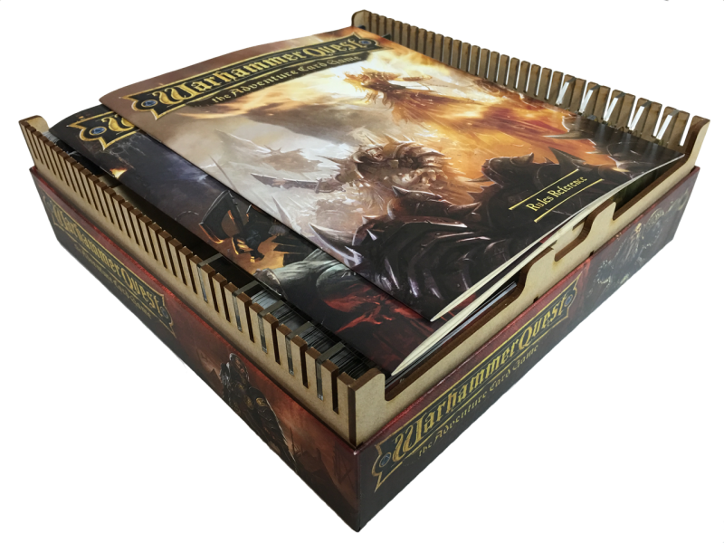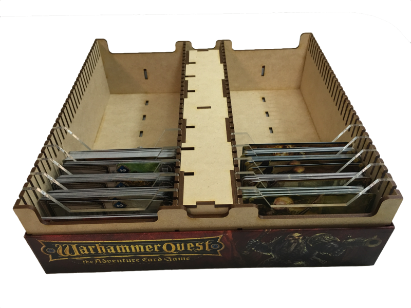 - This insert provides two (2) organizational lanes for horizontal card storage. There is ~5mm clearance at the top, which can accommodate a couple of rulebooks, large cardstock, etc.. The finished product results in a box that is 79mm high (~3″).