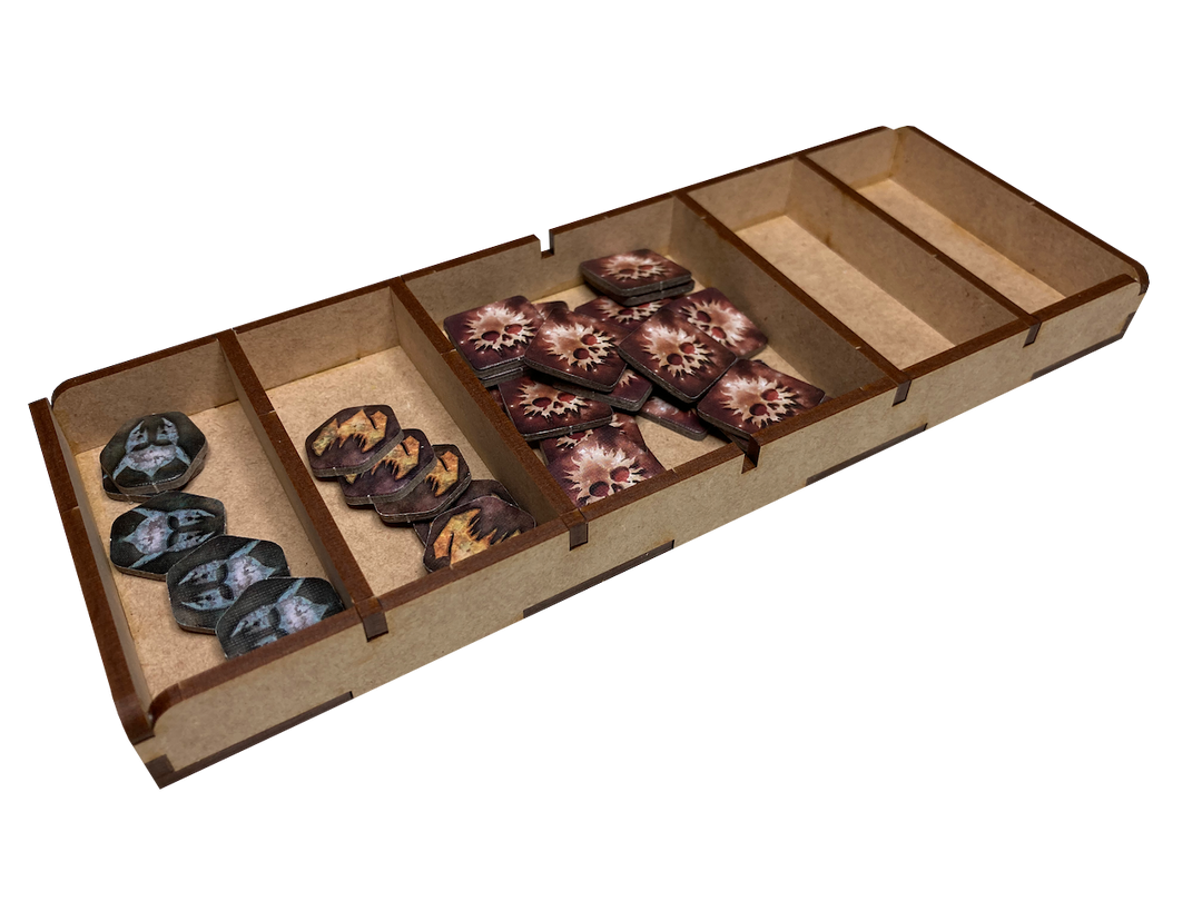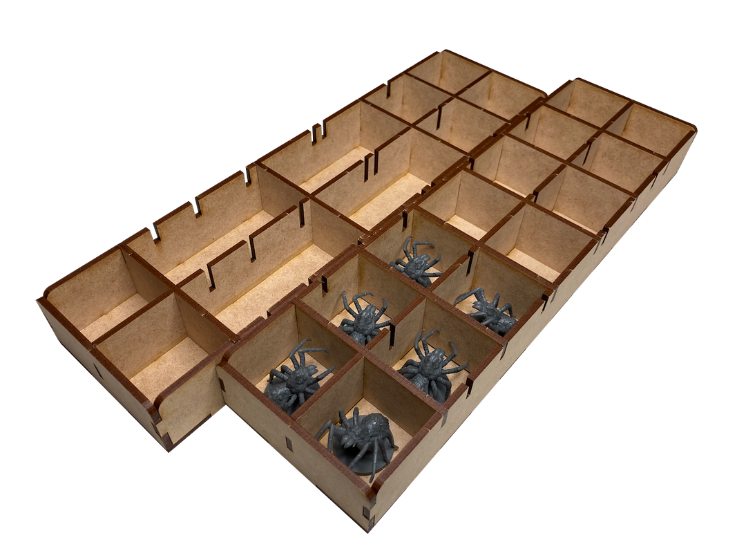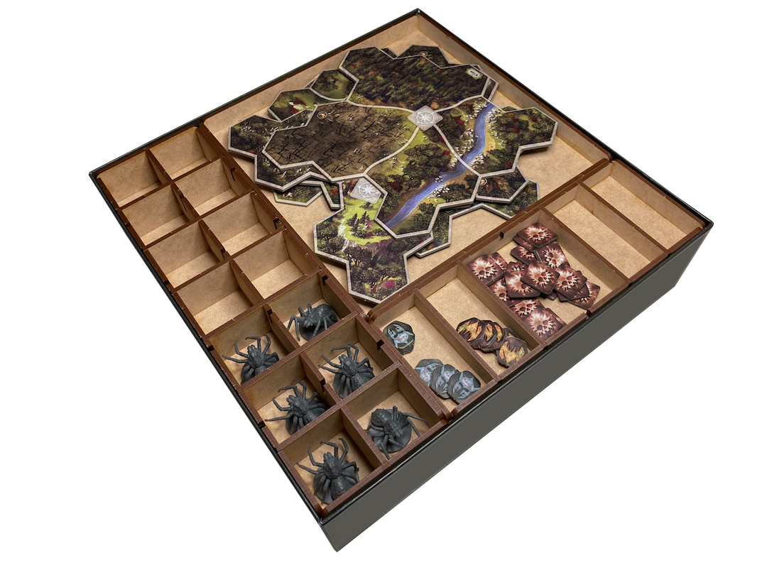 Our storage solution for Lord of the Rings: Journeys in Middle-Earth: Shadowed Paths expansion includes nine (9) removable trays and is intended to be placed inside the publisher’s game box.  This solution provides storage for minis, small cards, tokens, and map tiles and assumes you own our LRJ-001 organizer.  This solution includes an upgraded token tray for our LRJ-001.