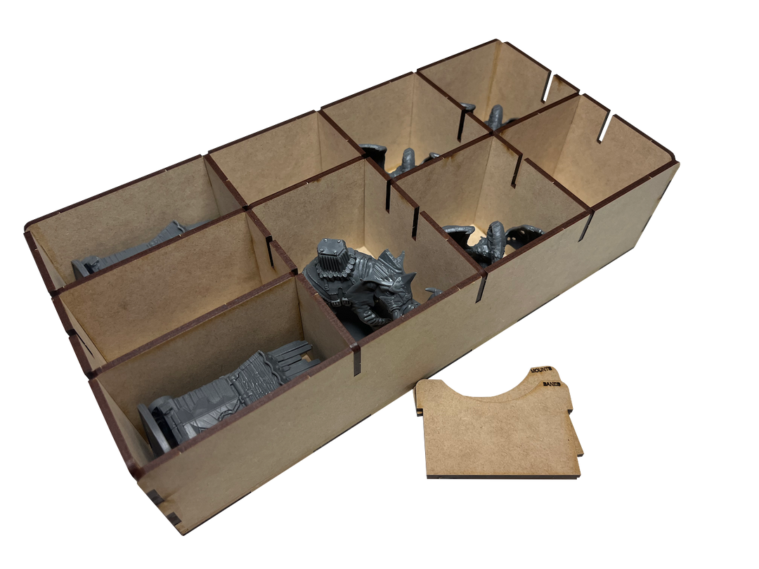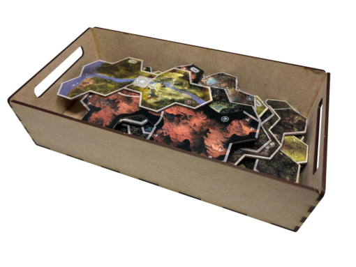 Our storage solution for Lord of the Rings: Journeys in Middle-Earth: Spreading War expansion includes two (2) removable trays and is intended to be placed inside the publisher’s game box.  This solution provides storage for some larger minis and map tiles.  The rest of the Spreading War components should be stored in our LRJ-001 and LRJ-002 organizers.