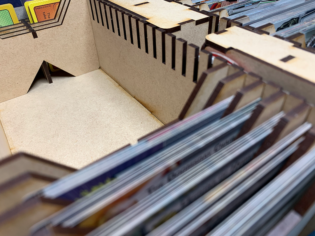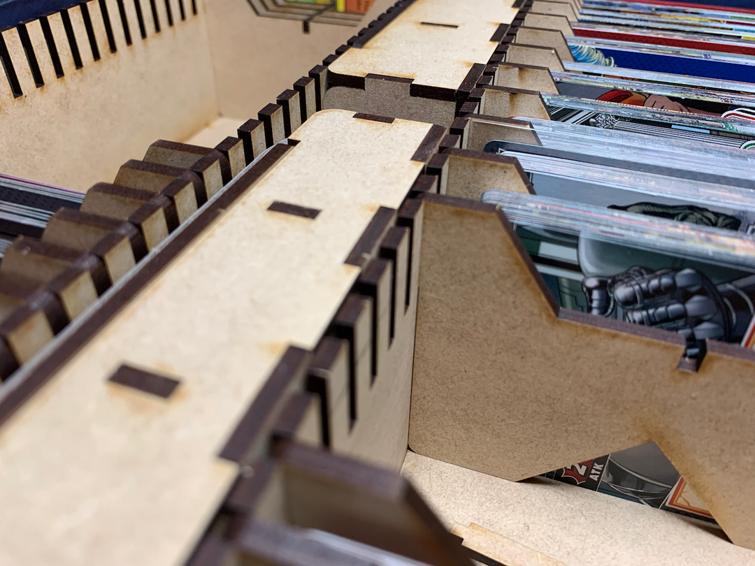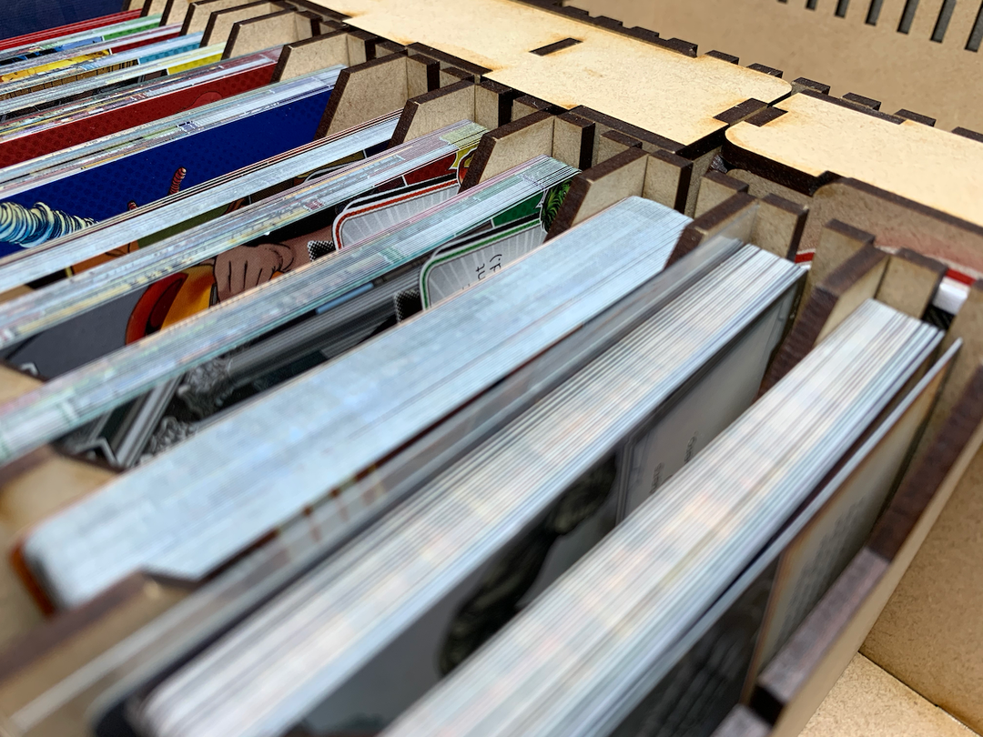 This solution provides 546mm of card storage for future growth. Unsleeved cards are .29mm thick; sleeved cards are ~.50mm thick. Each divider is 3mm thick.