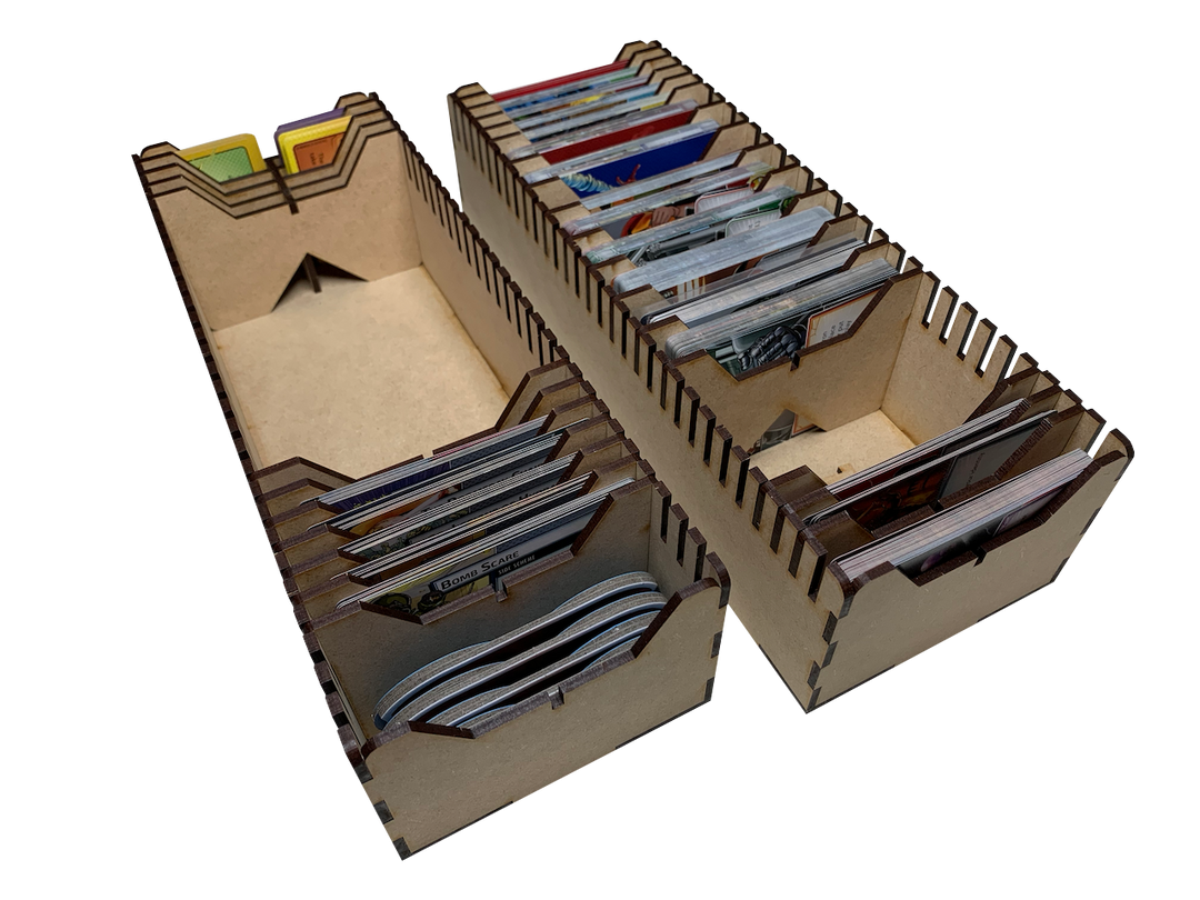 - two (2) large card trays, supporting sleeved or unsleeved cards
