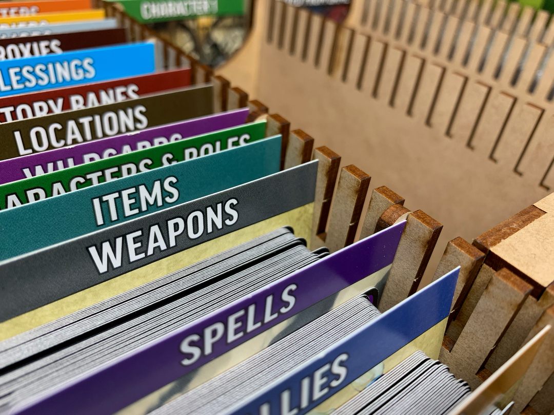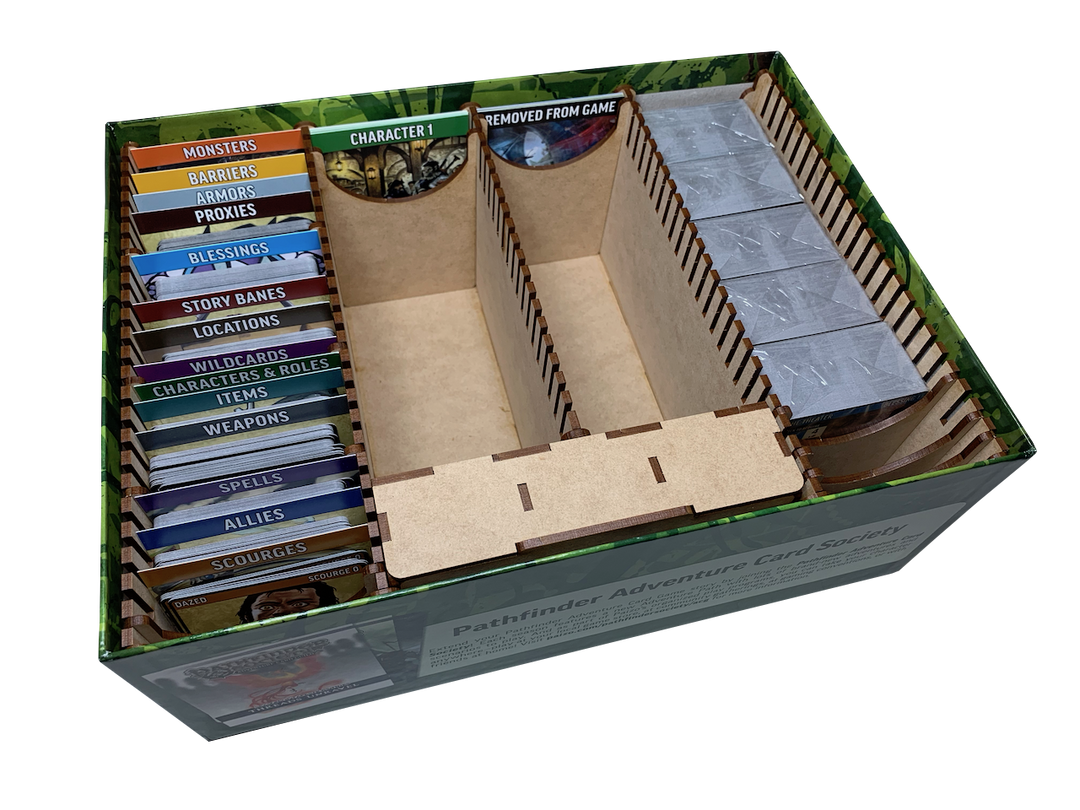 Our storage solution for the Pathfinder Adventure Card Game core set reboot (2019) provides structured card storage and two token trays to organize your character pawns and tokens.