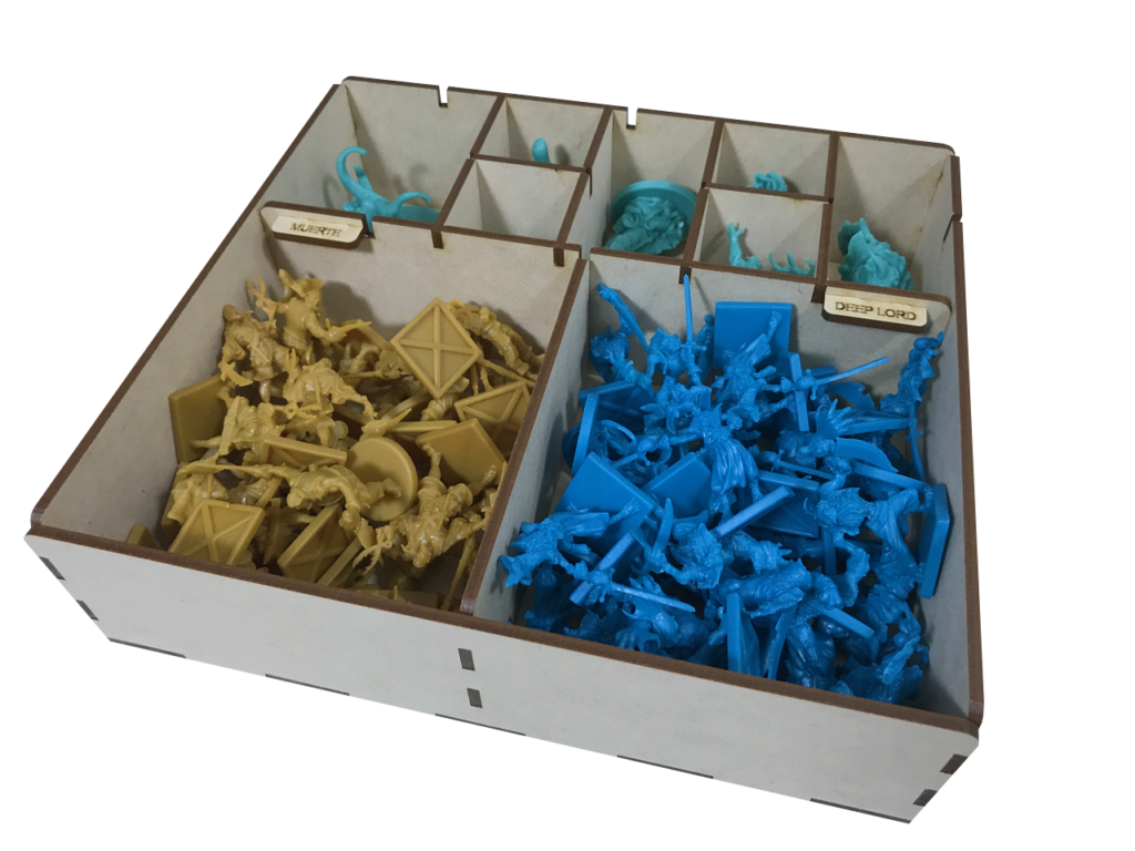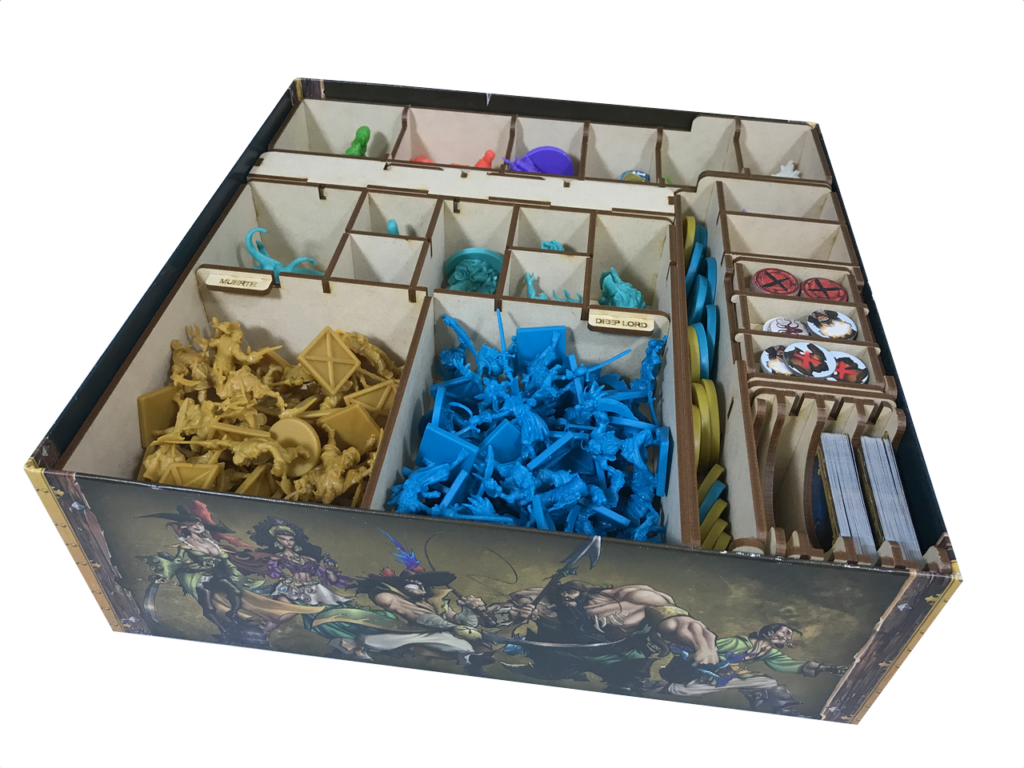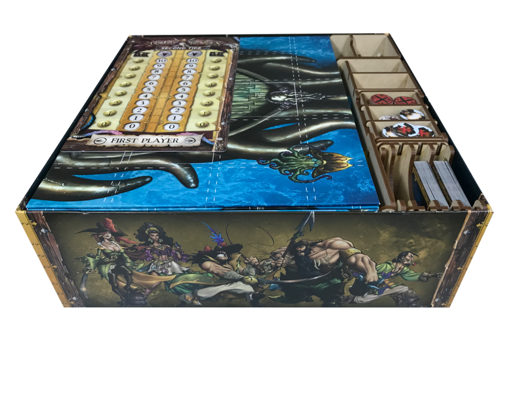 Our storage solution for Rum & Bones: Second Tide™ base game conveniently stores all base game components including ship boards, cards, tokens, dice, minis, as well as the sea monster minis and the hero expansions for Deep Lords and Marea de la Muerte.