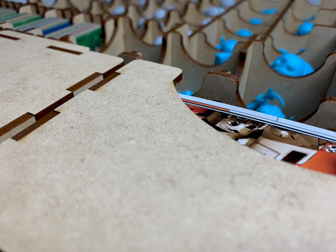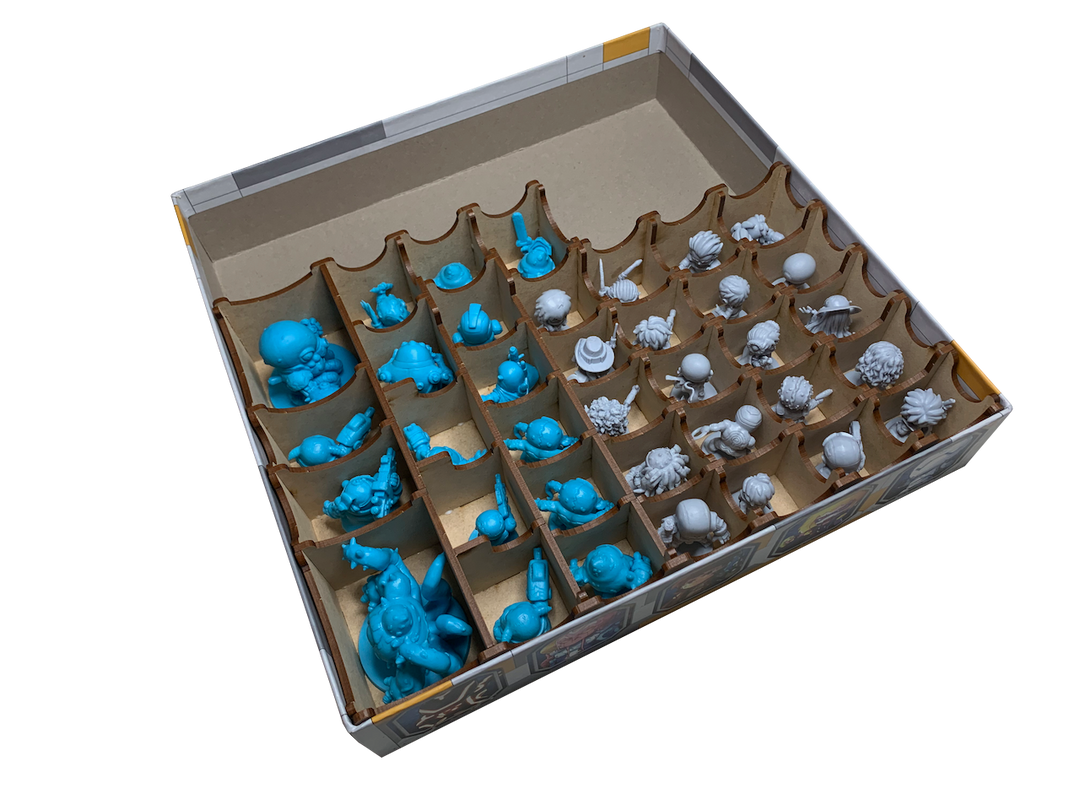 The mini storage provided in this solution includes sixteen (16) compartments for Space Marauders monsters and twenty (20) compartments for heroes.