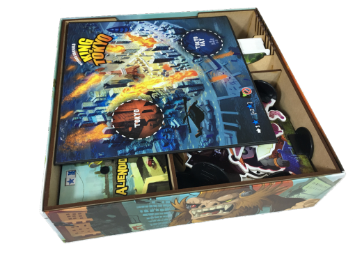 Note: this solution will work with the original editions of King of Tokyo/New York and with the new edition of King of Tokyo released in Summer 2016. The Summer 2016 box is 2mm shorter, but the insert fits fine. The game top closes fine.