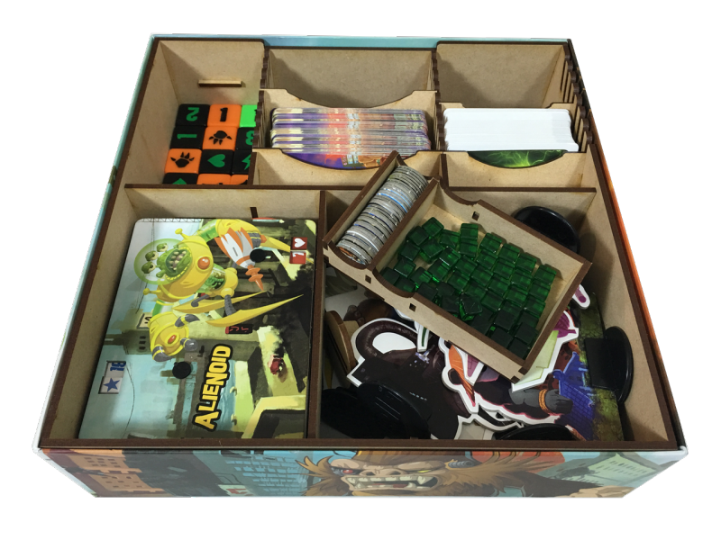We’ve done something special with our storage solution that’s compatible with King of Tokyo / King of New York – we’ve worked hard to deliver a quick building, very inexpensive solution that will organize your game play and storage. Our solution is designed to be used with either base game + expansions.