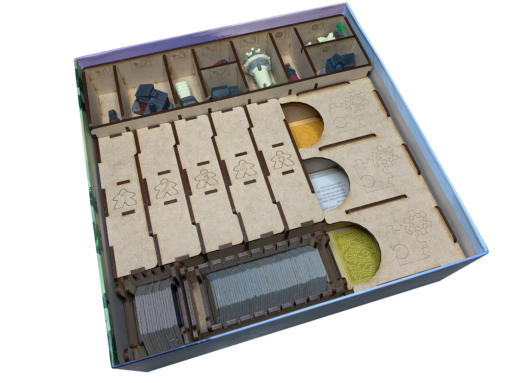 Our organizer for Tapestry provides a structured storage solution that allows you to get the game to the table quicker and includes a tile and card dispenser for use during play. Nine (9) trays are provided in the kit including five (5) player trays to get your game going quickly. Â We provide custom etchings for all landmarks used on the tech trees for fast setup and storage.
