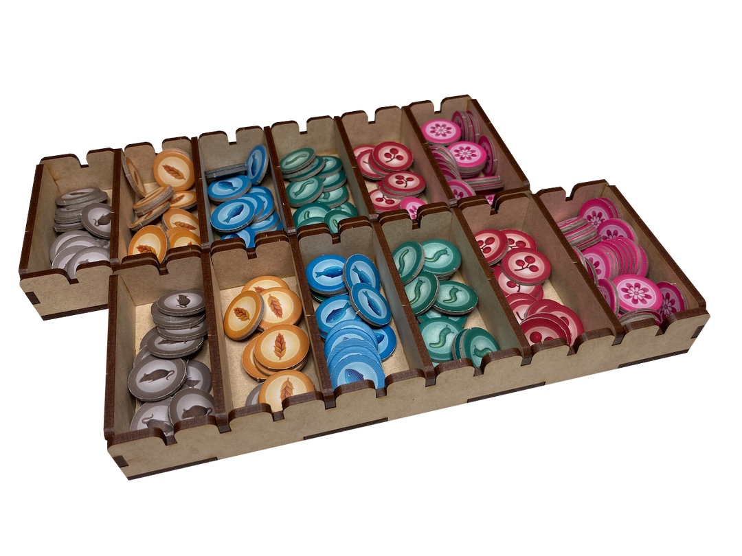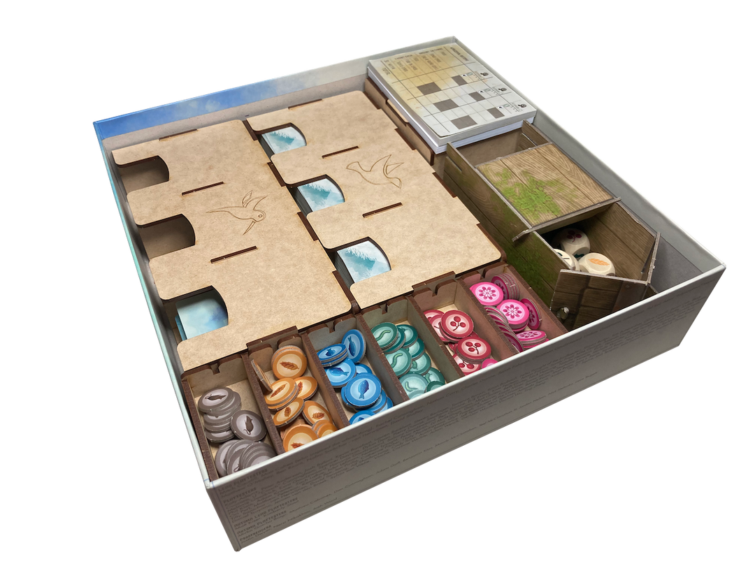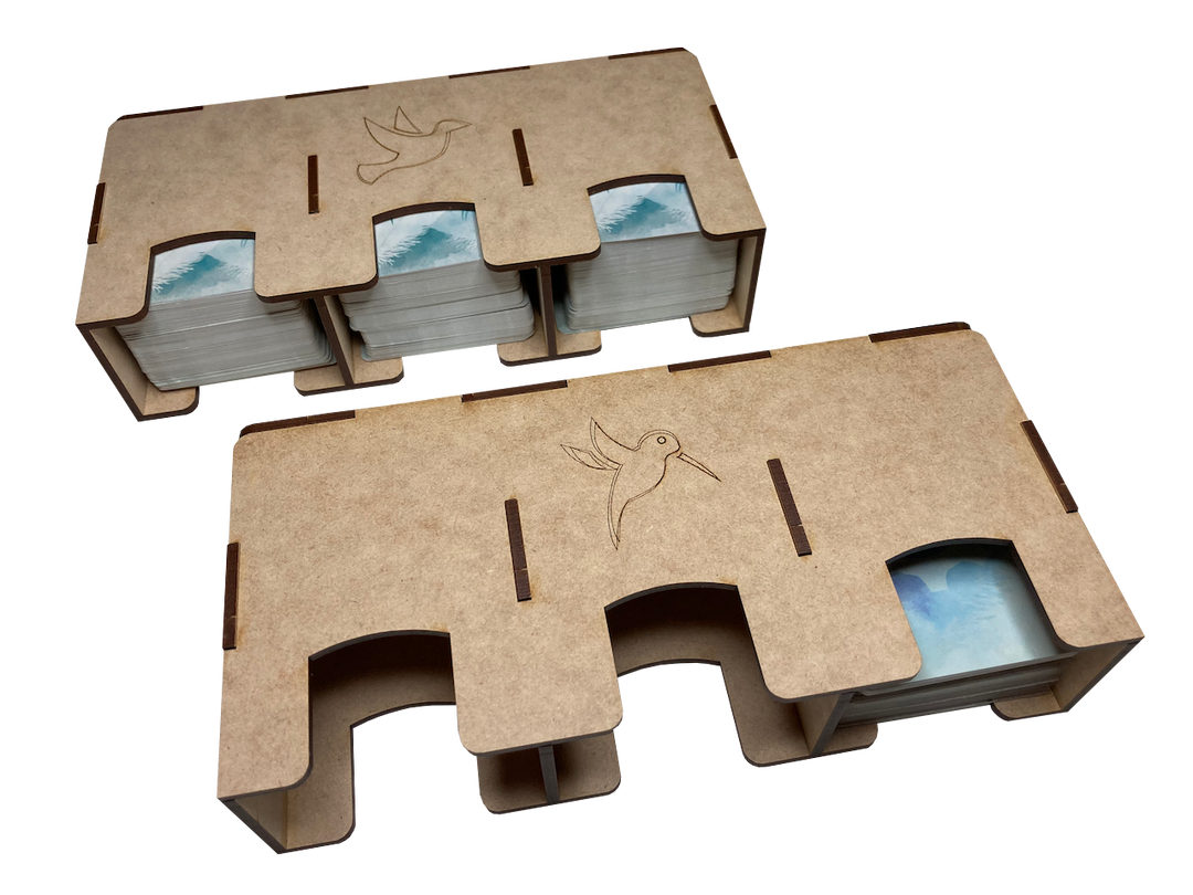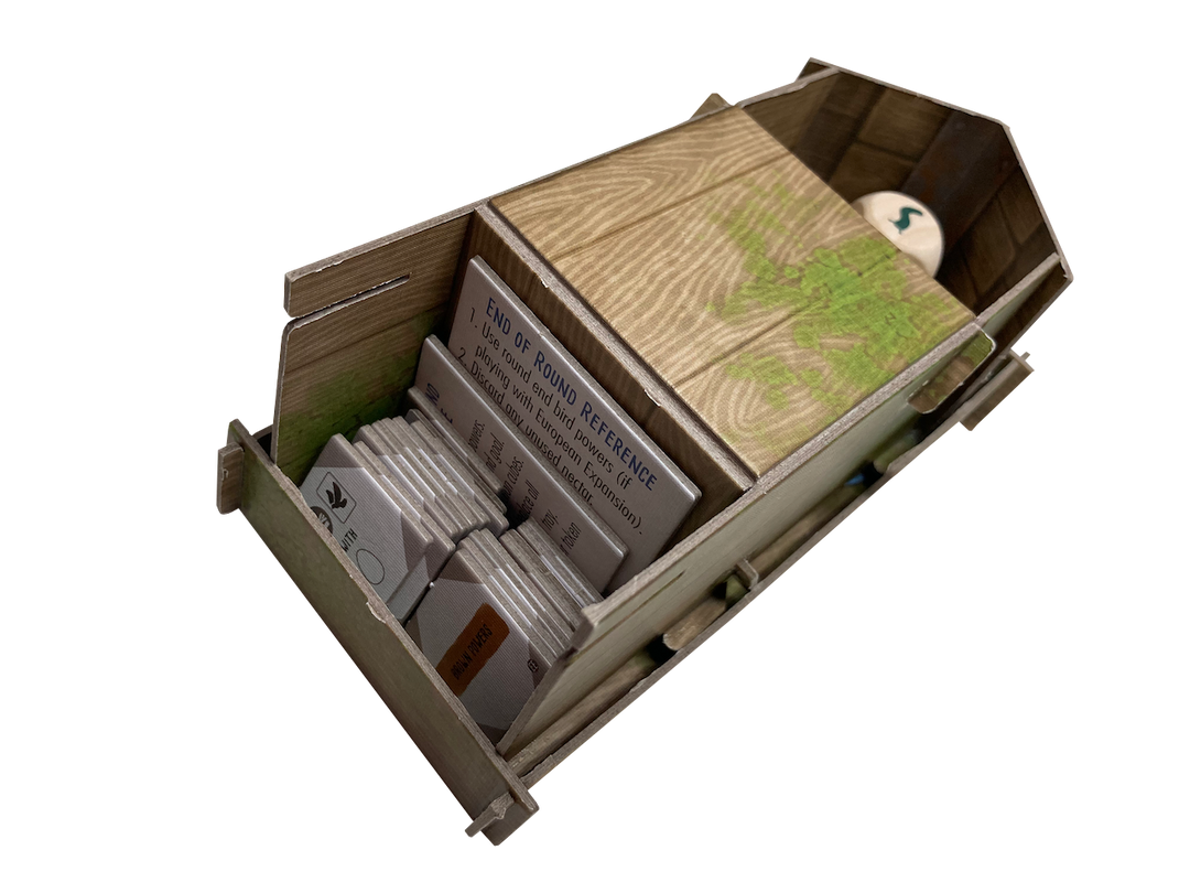 The Go7 Gaming organizer for Wingspan + Wingspan: Oceania + Wingspan:European provides room for your cards, tokens, dice, action cubes, food tokens, player boards (single set only), and birdhouse all in a single box!  Now you won’t need to cart around two or more boxes to get a game in!  Our card trays are designed to replace the plastic lid for card dispensing too!