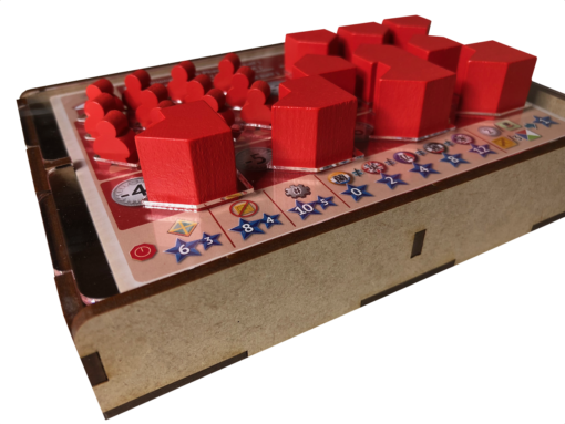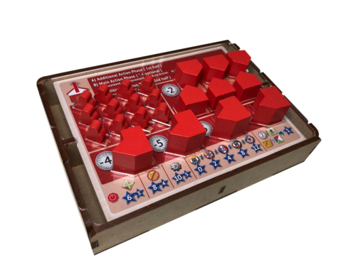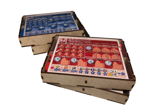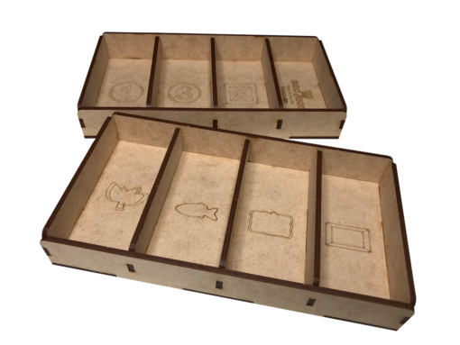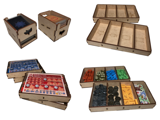 - one (1) top tray that provides storage for all player boards and larger tokens. We provide convenient lift cutouts beneath each compartment for quick removal of components