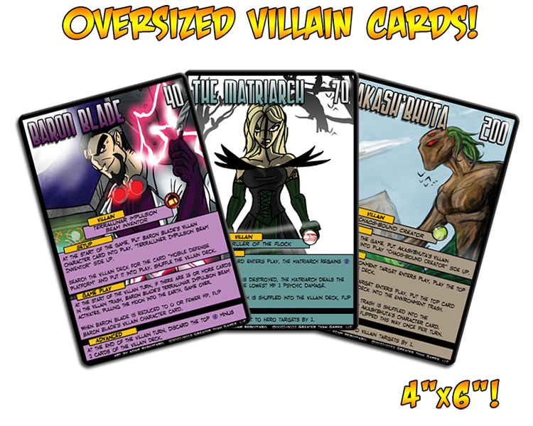 The first draft of Sentinels of the Multiverse included oversized villain cards that had the art for that villain and all of that character’s game text on one big card. Due to printing costs, we were unable to produce those; however, as part of the overfunding of our Enhanced Edition and Infernal Relics Kickstarter, we were able to produce this set! Since then, we’ve kept these oversized cards going, and they’re better than ever!