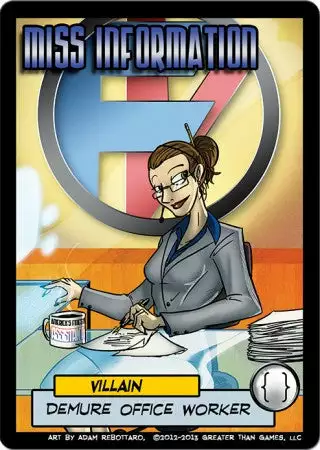Sentinels of the Multiverse: Miss Information Villain Character is a new villain character, with his own unique villain deck of 25 cards, a rules card, and a character card.