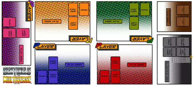 A full-color, 2′ x 4.6′ playmat printed with specific positions for decks, character cards, and trash for 3-5 Heroes, the Villain, and the Environment. Printed on high quality, scratch-resistant vinyl, these matts roll up concisely and resist damage.