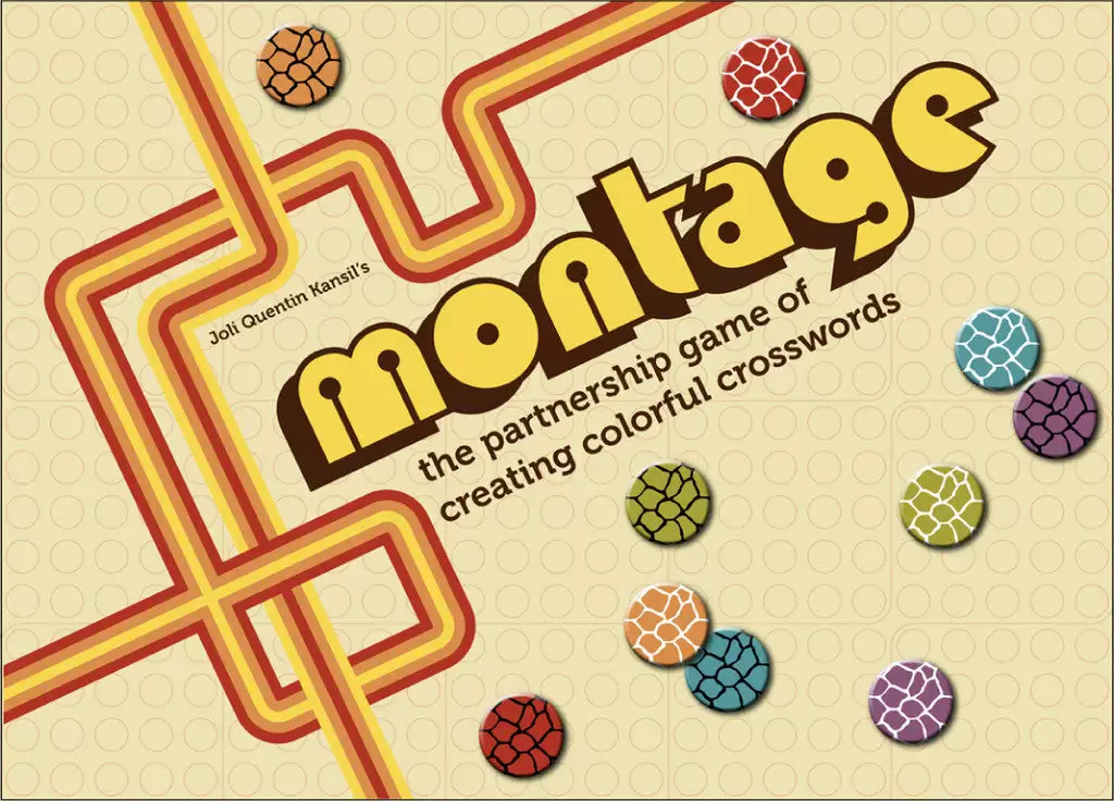 Montage is a partnership word game in which each player, in turn, thinks of a word, “spells” it on the crossword-like grid using color-coded tiles – each color corresponding to one vowel and five or six consonants, e.g. yellow is A/B/C/D/Z and green is U/T/V/W/Y/X – then gives a clue, in the hopes that his partner can guess the word before either of the opponents do.