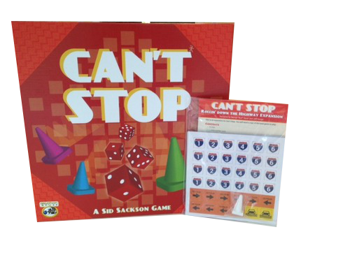 Can’t Stop: Rollin’ Down the Highway is an expansion for Can’t Stop by George “Bud” Sauer and Jeff Horger that adds 72 tiles that are placed on the Can’t Stop board before play starts. (You will need the base game of Can’t Stop to play.) When a player stops he checks each of his white markers and if there is a tile in the space they follow the rules to resolve the tile (including revealing any new tiles). The tiles have several different abilities including: