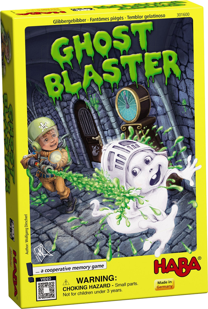 Together in Ghost Blaster, the players try to hit and trap the ghosts with the right amount of goo. Players must roll the dice in sequence and reveal the ghosts using the ghost hunter cards. Once the players have three of the same ghost cards face up, this ghost is caught and can no longer escape. But careful! If the players accidentally uncover a keyhole card, the ghost hunter is caught in the trap and must then go into the dungeon. Players can free him but that takes up valuable time! Their objective is to capture all of the ghosts before the ghost hour is over.