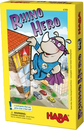 Players each start the game with five roof cards, and they take turns adding walls and roofs to a single building. On a turn, you first place walls on the highest floor, then you choose a roof card in your hand and place it on the wall. Each roof card bears markings that indicate where the next player must place walls on the card. In addition, some roof cards force a player to perform special actions, such as placing a second roof, changing the direction of play, or moving Super Rhino to a new location on the tower. Keep your hands steady!