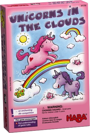 To start, all unicorns stand on the thundercloud. On a turn, a player rolls the blue storm die and either moves 1-3 clouds or stands in place eating a muffin, forgetting all about the race, the crystals, and everything else. If you land on a pink cloud, you roll the crystal die and receive 1-3 crystals; if you land on a present, you give someone else a crystal from the reserve; and if you land on the front end of a rainbow, you slide along the path to the next cloud. Whoever reaches the final cloud first claims the four crystals there, then players compare their holdings to see who horned their way to victory.