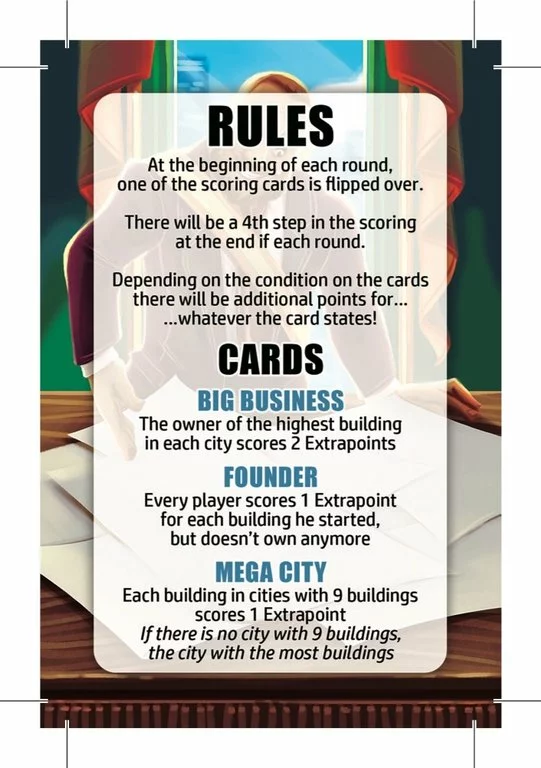 These cards are shuffled, placed face down, and the top card is drawn at the start of each round. They result in an additional fourth step in the scoring at the end of each round. Points will be awarded based on the conditions listed for each card.