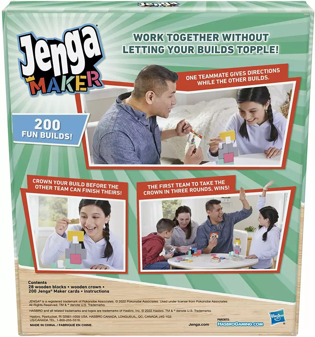 Jenga is a registered trademark of Pokonobe Associates. Hasbro Gaming and all related trademarks and logos are trademarks of Hasbro, Inc.