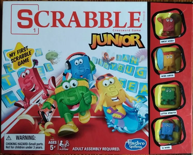 This is a version of Scrabble for players aged 5-12 featuring a double-sided board. The introductory version resembles more a crossword puzzle in which all the possible words have already been spelled out. This is an aid to learning about spelling. Points are earned by completing words. The reverse side is an entirely blank grid [1], leaving players to come up with their own words. A point is earned for each letter placed. Letters are formed from cardboard tiles and do not have values.