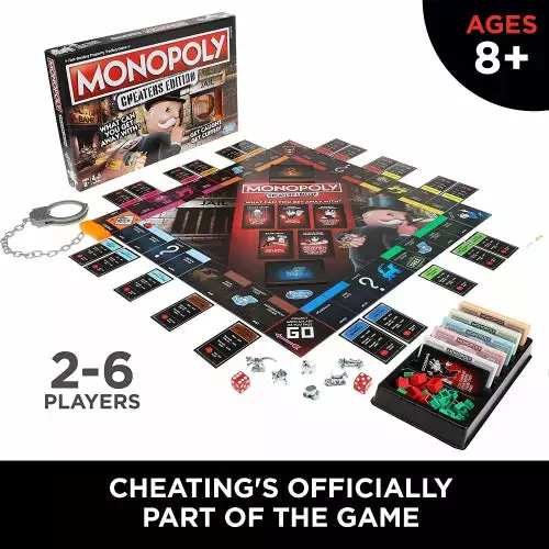 Make this wildly different Monopoly game a favorite go-to game for game nights and other fun get-togethers. Lean into those iconic (yet unspoken) Monopoly moments in which rules are bent, money is borrowed, and funny business is welcomed. The outlandish suggestions on the board, cards, and rules encourage players to express their inner cheater to own it all while they buy, sell, dream, and scheme. Fake a die roll, steal some bills from the bank, and even skip out on rent. Complete a cheat to get a reward, but fail a cheat and pay the consequences! No houses in this edition – only hotels – and pretend handcuff unit may leave players “chained” to the board. The Hasbro Gaming, Parker Brothers, and Monopoly names and logos, the distinctive design of the gameboard, the four corner squares, the Mr. Monopoly name and character, as well as each of the distinctive elements of the board and playing pieces are trademarks of Hasbro for its property trading game and game equipment.