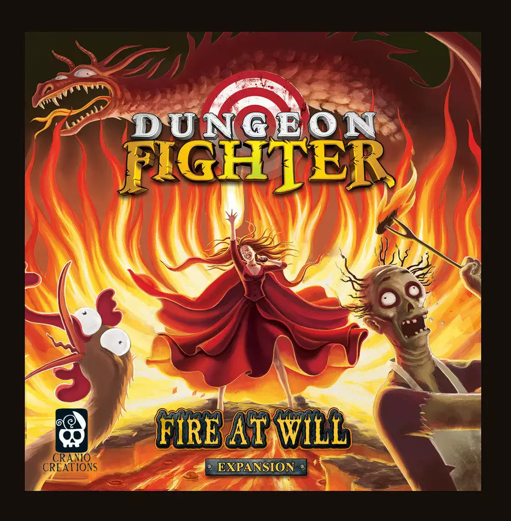 Dungeon Fighter: Fire at Will! is the first of four expansions for use with Dungeon Fighter, each themed to one of the four elements: air, earth, water and fire. In addition to adding new monsters, new weapons, new items and new armor, each expansion introduces a new game mechanism and three new ways to complicate your ability to throw dice at the targets on the game board. With this expansion, fire, you need to throw the die through a “burning” ring of fire held in the air. You might also need to bounce a die through a gate, toss three dice held in a row, or roll a die down a board and bounce it onto a target. The goal remains the same as the base game, survive the dungeon and defeat the boss!!