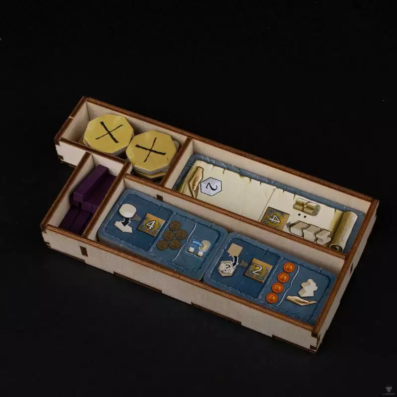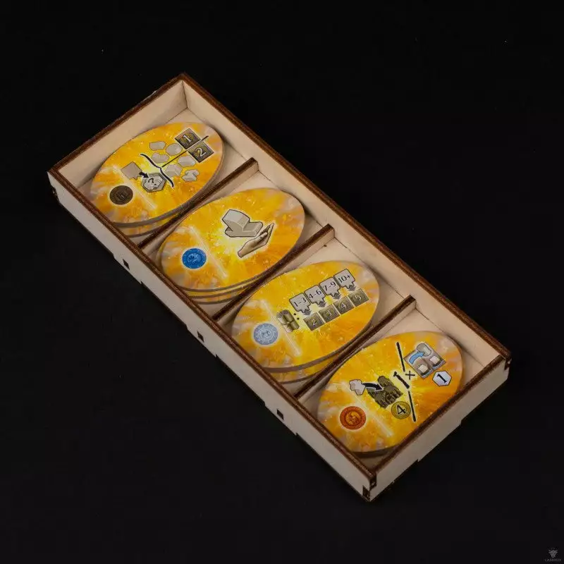 Terra Mystica is definitely an old time favorite among board gamers. With the second expansion released: Merchants of the Seas the space in the base game box definitely got small. This new organizer was designed to fit inside the original expansion box (with help of the raiser platform) or on top of our original organizer and lift the lid accordingly.
