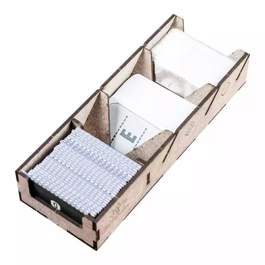 • 1x card holder with partitions for base card deck, expansion deck and expansion tiles. (Space for sleeved cards 60micron – eg Sapphire);