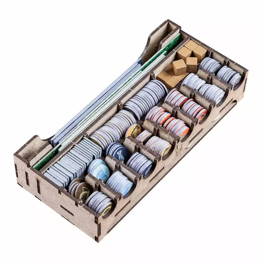 • 1x resources and players strips box, with spaces for each resource, further divided in 2 housings for each resource for quick setup related to number of players.