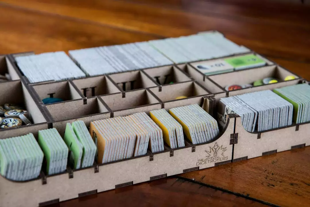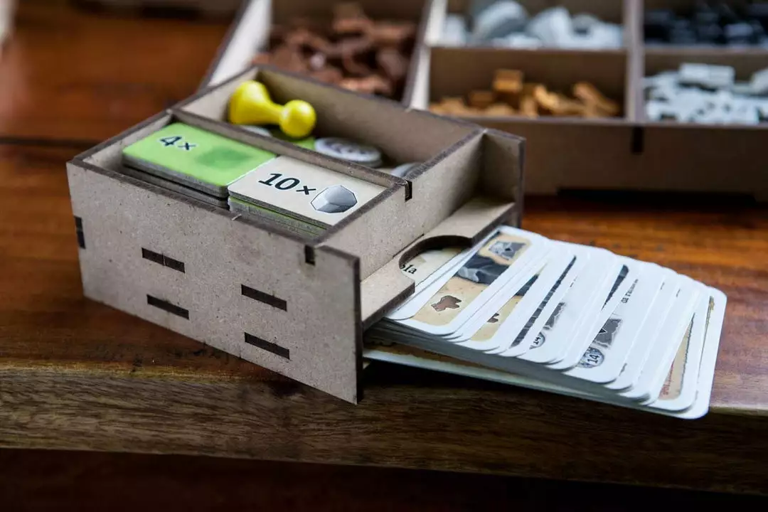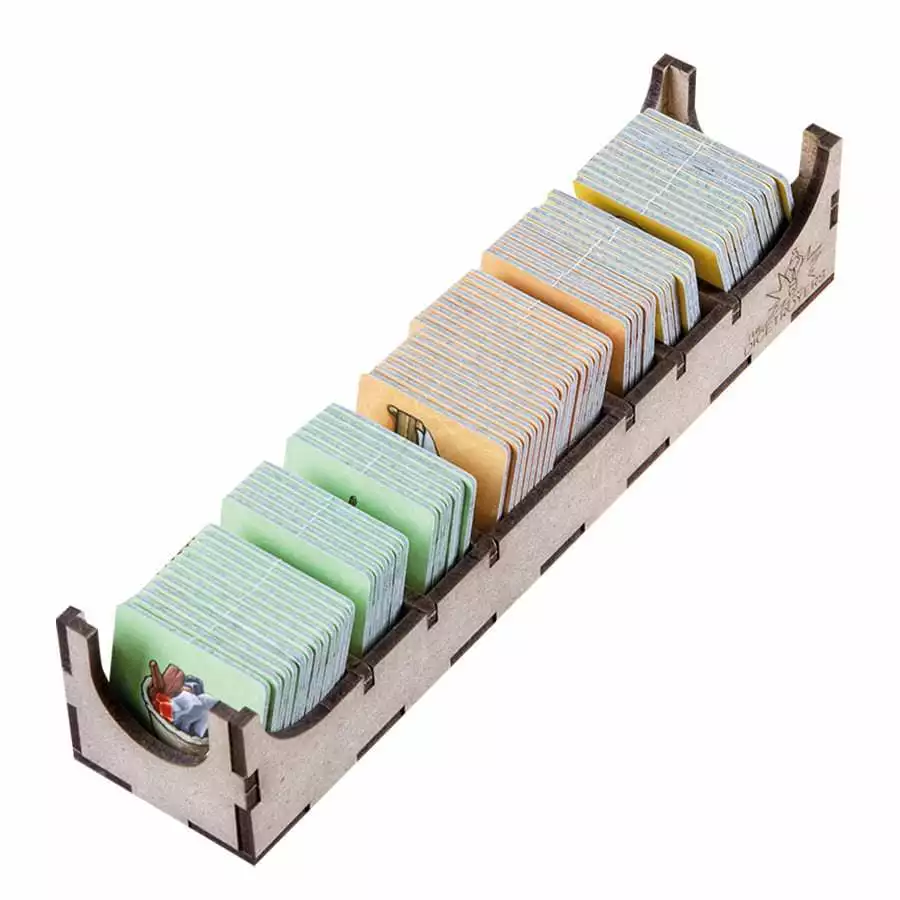 • 1x card and token holder, with spaces for begging tokens, first player token, 5th dwarf etc;