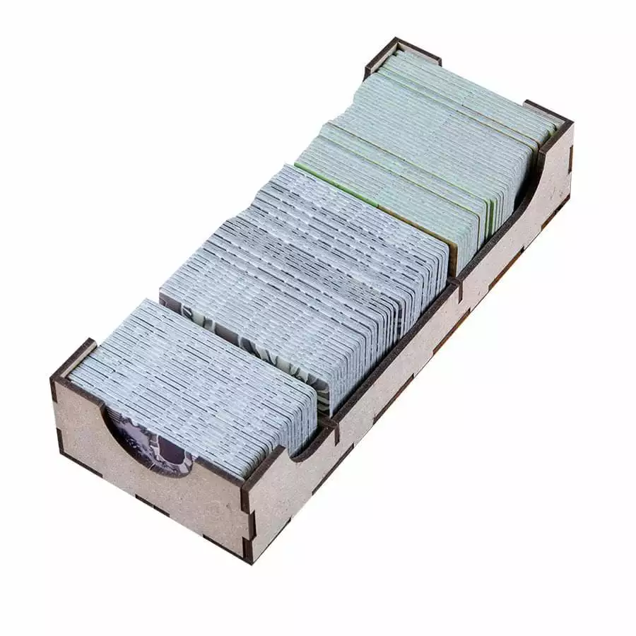 Designed to fit into the game box. Designed for both sleeved and unsleeved cards.