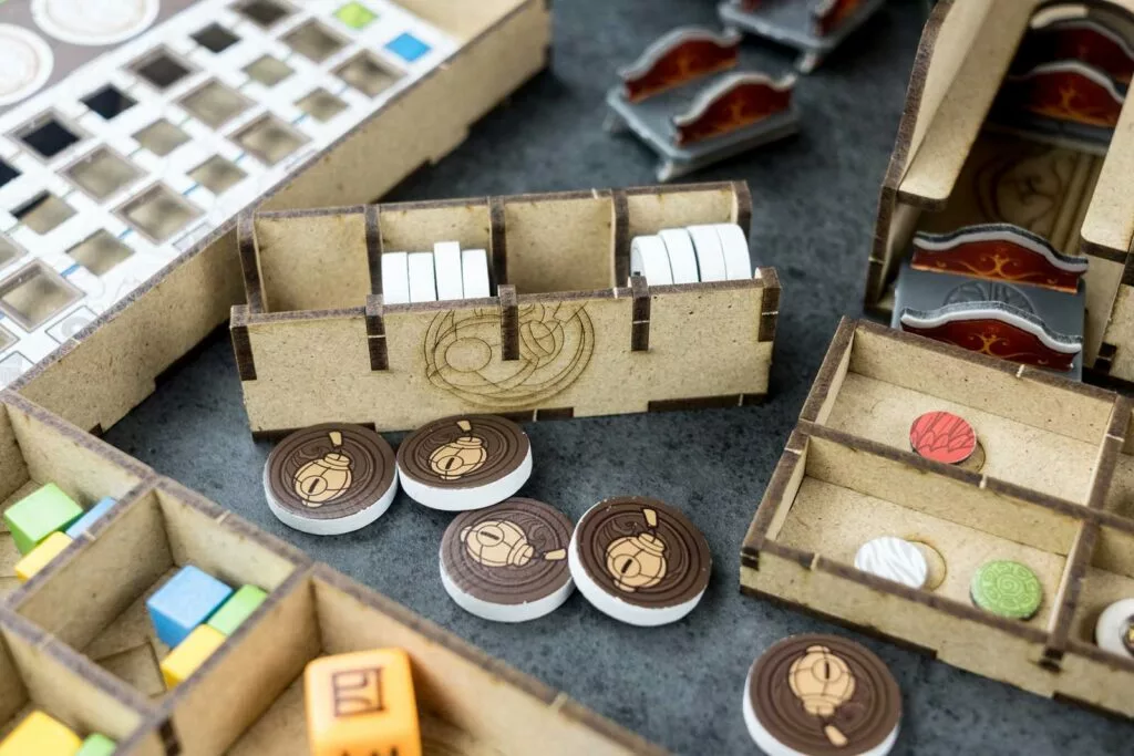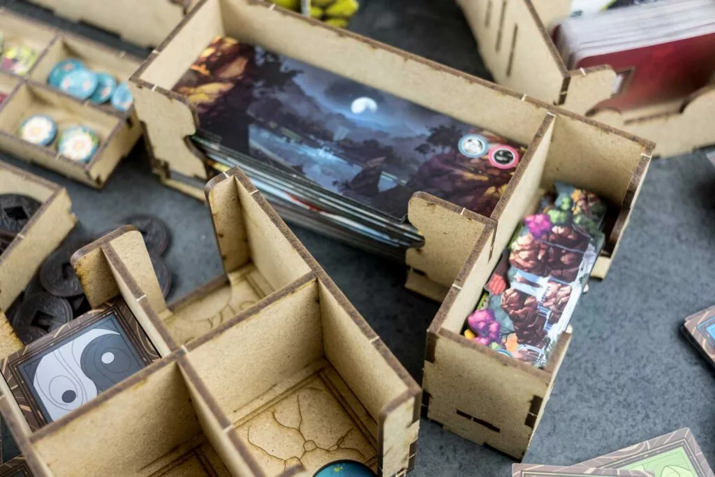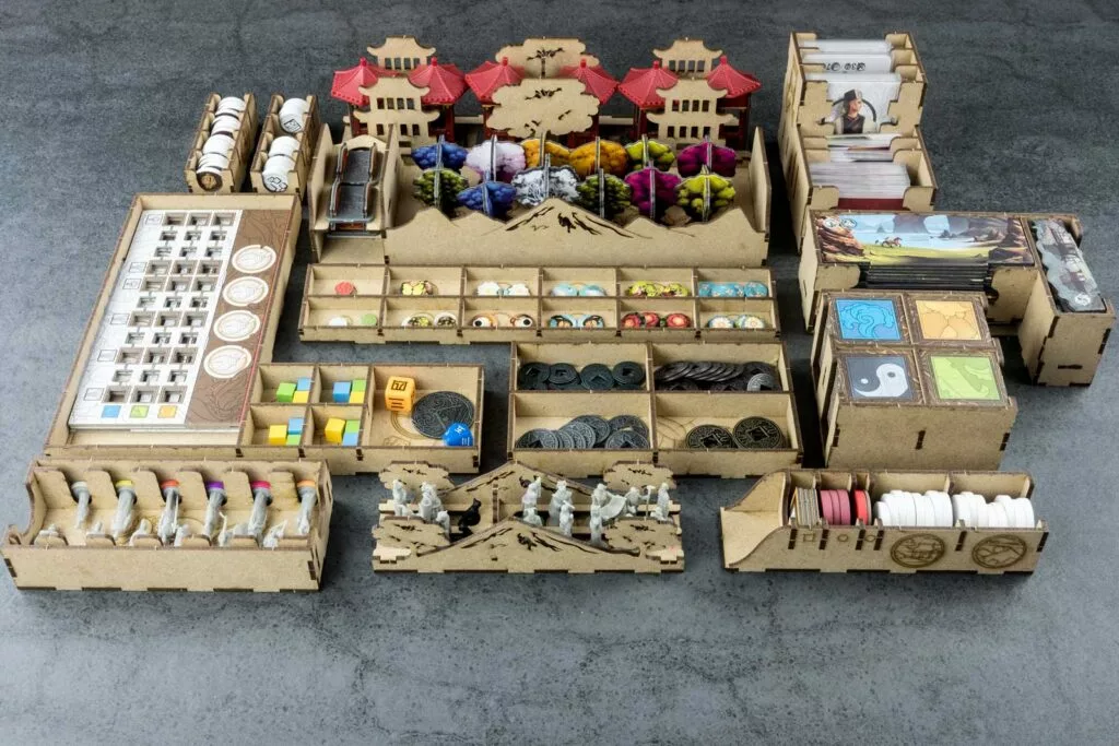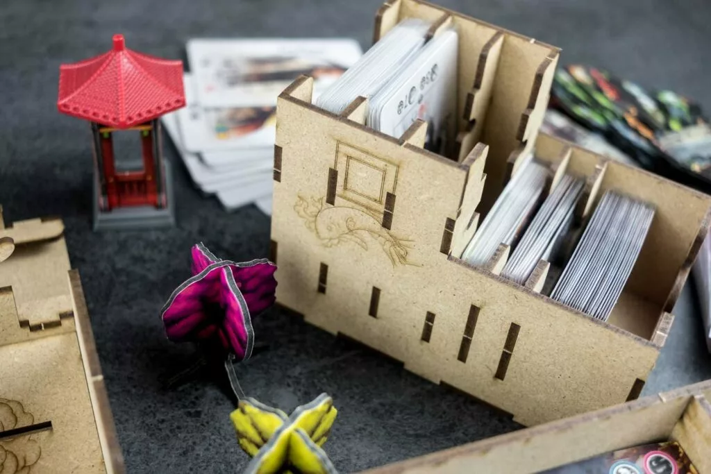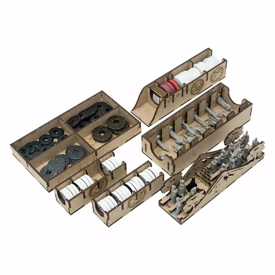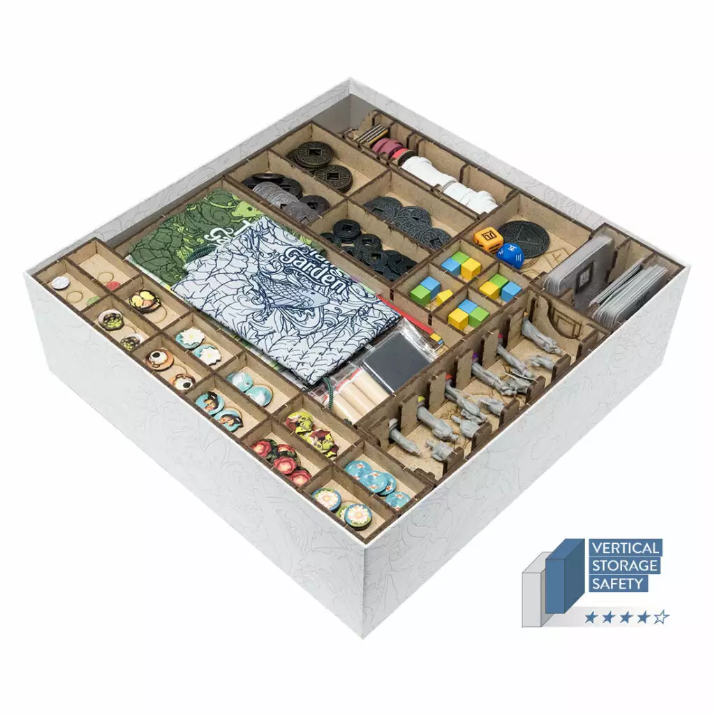 Organizer compatible with Tang Garden (base game or with expansion Ghost Stories; Golden Age). This organizer can fit alternatively just the base game or base game + expansion/s. Slots are designed both for retail or kickstarter exclusive components, , including miniexpansions The Wayfarer and The Herbalist