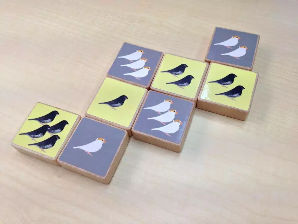 In Jushimatsu (“Ten Sisters”), you are the owner of some cute finches. You and an opponent take turns placing one tile down at a time, and tiles depict 1-4 finches. You win when you line up more than ten finches of your own color in a vertical, horizontal or diagonal line.