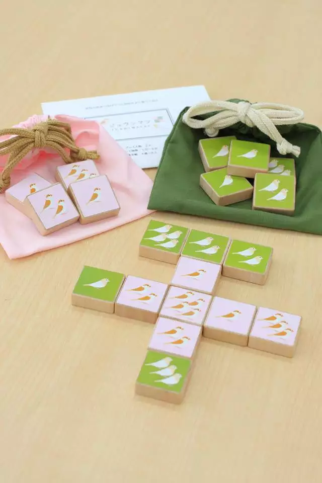 The basic Jushimatsu set is for only two players, but you can combine a “finch and egg” set of another color to play with three or more players. (“Jushimatsu” is a kind of Japanese finch (Society finch or Bengalese finch), and the name means “ten sisters” because they are so friendly to each other like good sisters.