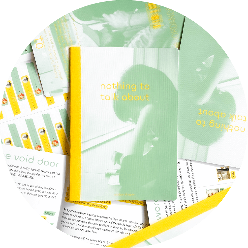 Nothing To Talk About is a zine with 9 games for 2 people to play over any messaging app. All of the games are vastly unique, with a range of styles and mechanics. Use these as an ice breaker, a stress reliever, a creative brainstorming tool, or a way to explore a relationship! Each game encourages play through a ritualized setting. One simply needs to send a photo of a single page of rules to someone on the other end of their phone, and the game begins!