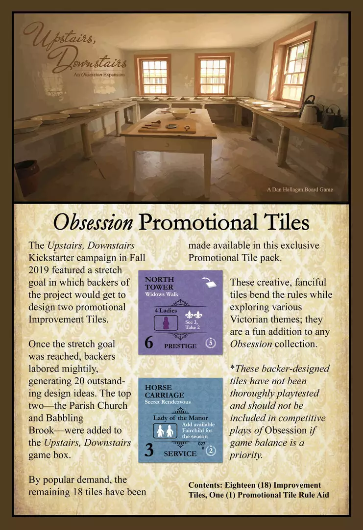 These twenty (20) promotional tiles were developed as part of a stretch goal during the 2019 Upstairs, Downstairs Kickstarter campaign.