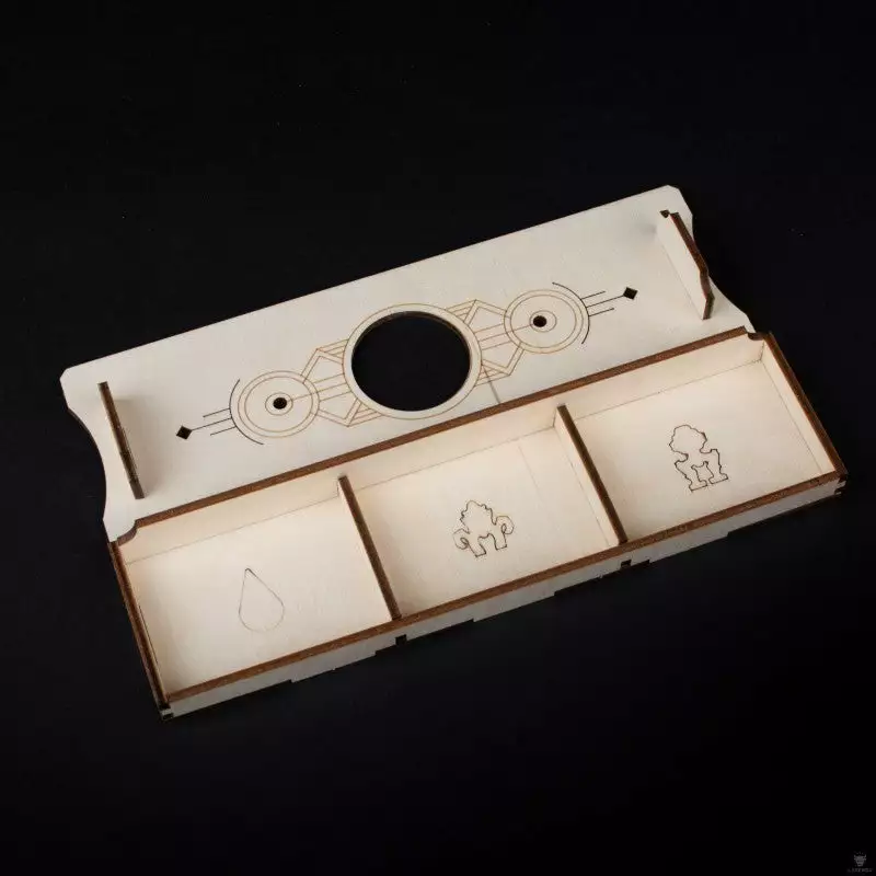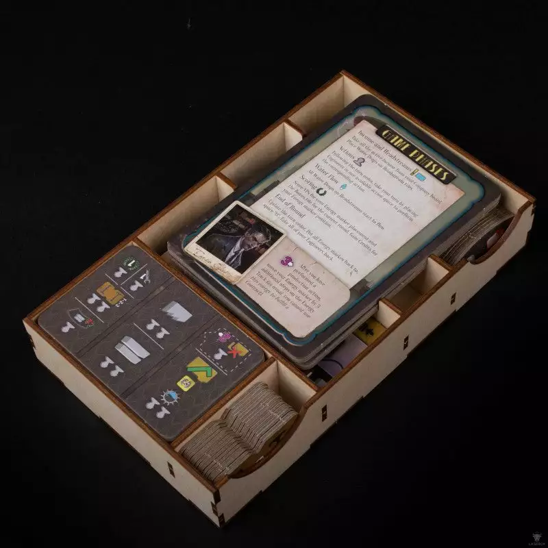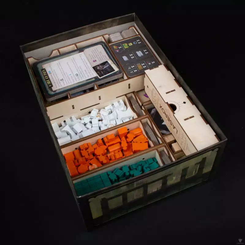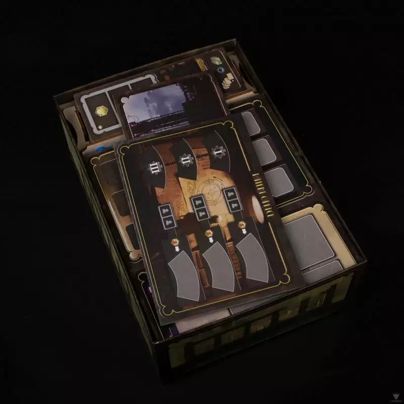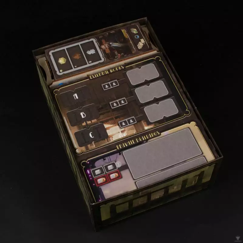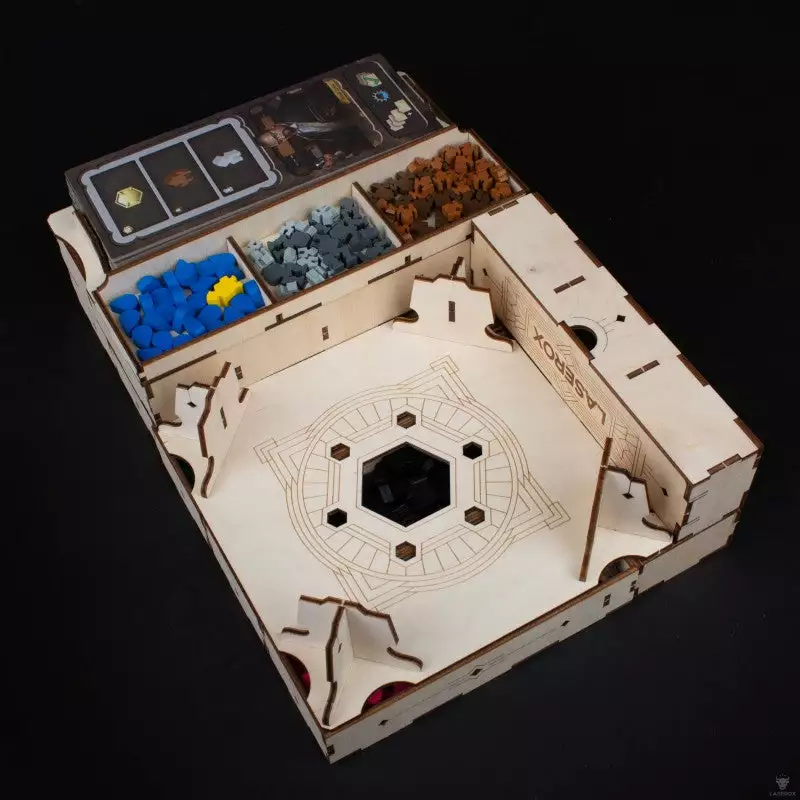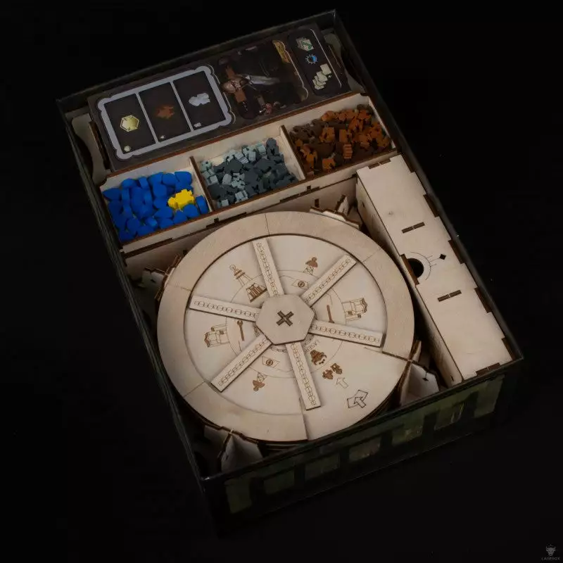 In Barrage players compete to build their majestic dams, raise them to increase their storing capacity, and deliver all the potential power through pressure tunnels connected to the energy turbines of their powerhouses. Our organizer was designed to hold all components of the base game and expansion within the base game box neatly stored and ready for a quick setup before gameplay.