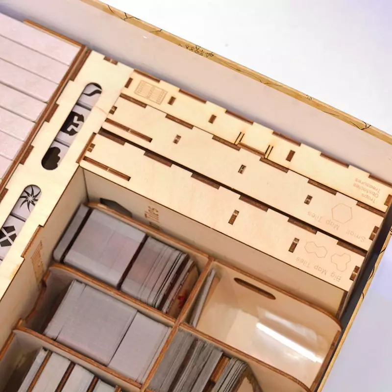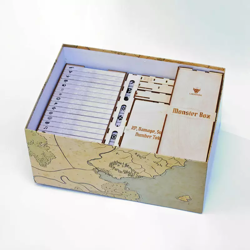 – 3 boxes with lids for all the map hexes, traps, obstacles and treasures featuring an indication on the side to know which box you are going to take out