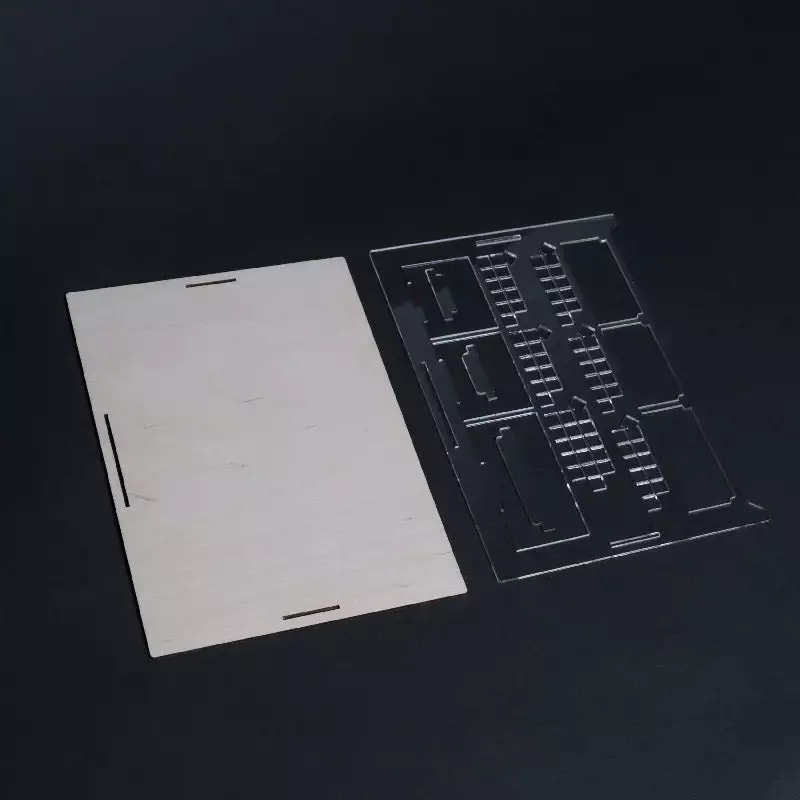 It comes with an acrylic overlay, which is locked in place with a wooden part beneath the playerboard. Three notches come with the overlay, which precisely fit into the holes and lock it together. Some cut-outs are slightly moved, which come from the original player mate design itself. Please be aware of that.