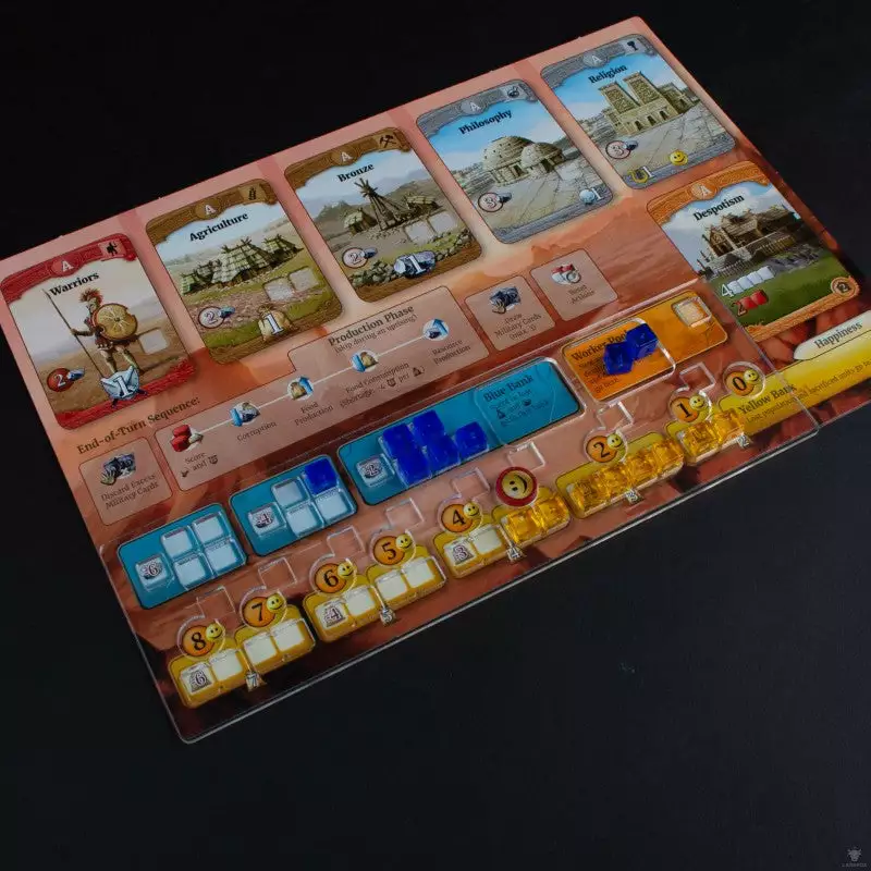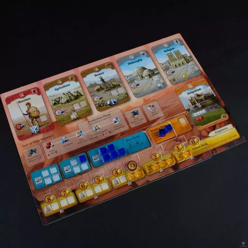 Wander through the Ages and make sure, your cubes and workes are have a firm ground. Our overlay designed to fit the new edition from Czech Games will make sure, that all cubes stay in place. It will fit inside our Through The Ages Organizer.